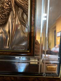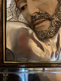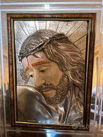 Quadro con immagine di Cristo sopra elevata, in argento, su specchio e cornice in legno.