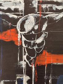 “Cristo in croce", acrilico su tela 60x90 con finitura in resina, è un lavoro che gioca sporco con l’iconografia sacra e vince proprio per questo. La croce c’è, è evidente, ma non è consolatoria. È spezzata, graffiata, quasi scorticata dal gesto pittorico. Non salva nessuno. Sta lì a ricordare che il peso esiste, e che qualcuno lo porta sempre.