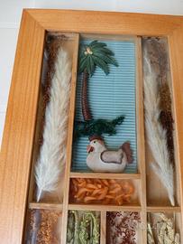 Cornice in legno chiaro dimensioni: 22 x 45 cm. All' interno del vetro sono contenuti mazzetti di erbe, pasta,ecc..