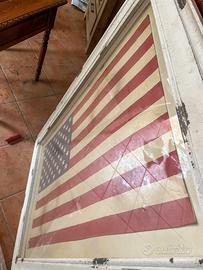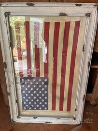 Attorno alla bandiera, c'è una cornice in legno, realizzata in un legno pregiato, levigato e ben rifinito. La cornice è dipinta di un bianco luminoso che contrasta elegantemente con i colori della bandiera, evidenziando la sua presenza. La cornice ha linee semplici ma sofisticate, con angoli leggermente arrotondati, donando un tocco di raffinatezza al quadro. Nel complesso, il quadro rappresenta un forte simbolo di orgoglio e unità, perfetto per decorare un muro in un'ambiente domestico o in un luogo pubblico.