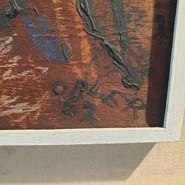 Davide Orler (Venezia, 1932 – 2010) Titolo: Cristo Anno: 1968 Tecnica: Olio su faesite Dimensioni: 22 × 32 cm (esclusa cornice) Firma: In basso a destra “Orler” Dedica autografa sul retro Opera autentica di Davide Orler, uno dei principali pittori veneziani del Novecento. Questo intenso Cristo del 1968 appartiene al periodo espressionista dell’artista, in cui la pittura diventa più materica, spirituale e vibrante di luce. I toni caldi del fondo e i blu luminosi dello sguardo trasmettono una forte tensione mistica, tipica della produzione di Orler alla fine degli anni Sessanta. L’opera è eseguita su faesite, con pennellate corpose e segni rapidi che testimoniano l’immediatezza gestuale dell’artista. Sul retro è presente una dedica autografa di Davide Orler, che conferma l’autenticità dell’opera. Cornice originale d’epoca inclusa, in ottime condizioni generali. Provenienza: collezione privata.