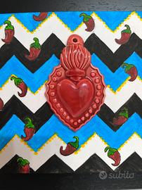 Quadro decorativo artistico in stile pop con cuore sacro in ceramica colore rosso vivo in rilievo su tela decorata completamente a mano, completa il tutto una cornice in legno 26×26 colore nero. Articolo Nuovo