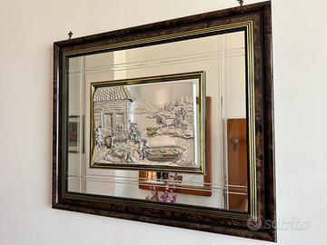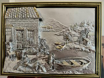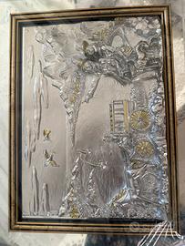 Quadro decorativo con bassorilievo in argento raffigurante una scena classica. Nuovo, ancora nella confezione originale. Cornice in legno, interamente fatto a mano. Volendo ne ho un altro identico ma con raffigurazione diversa come nelle ultime 2 foto. Ritiro a mano zone Roma est, Guidonia, Frosinone