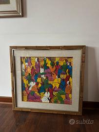 Vendo bellissimo quadro etnico dai colori vivaci raffigurante una scena di mercato africano, ricco di dettagli e molto decorativo.