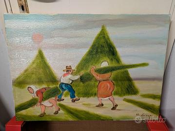 Dipinto del pittore ferrarese "naif" Nino Zagni - La raccolta della canapa. Olio su tela 50 x 70 cm Altre opere dell'autore nel profilo.