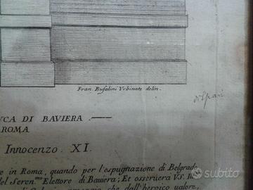 La stampa mostra l'elevazione di un arco trionfale disegnato da Ludovico Gimignani per le celebrazioni il 21 settembre 1688 a Roma in onore del principe elettore Massimiliano Emanuele di Baviera per la sua partecipazione alla guerra contro i turchi e alla cattura di Belgrado nel 1688.