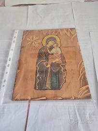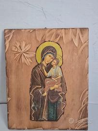 Icona religiosa della Madonna della Tenerezza, montata su tavola di legno.