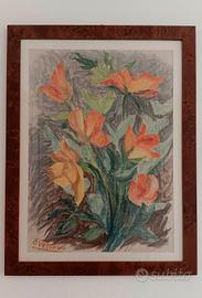 Bellissimo quadro "FIORI" tecnica a cera , del noto pittore piacentino ENZO VESCOVI, ottima cornice effetto radica, periodo anni"80.
