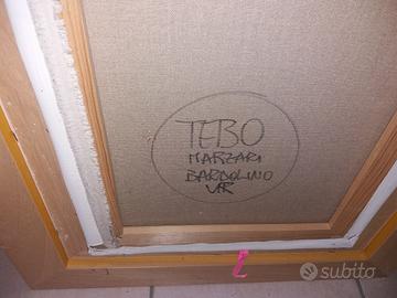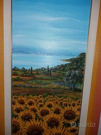 quadro di dimensioni 35×95 girasoli con Bardolino e il lago di Garda dipinto da TEBO MARZARI da Bardolino