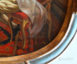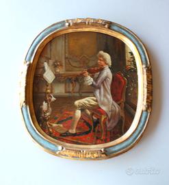 Bellissimo quadro dipinto a mano ad olio, su base in legno, avente come oggetto un interno con un violinista in un costume del 1700, realizzato dal pittore di origine veneziana Giorgio Macola nel 1960 circa. Giorgio Macola si trasferì giovanissimo in Svizzera e divenne l’allievo prediletto di Jean Vernet, noto autore di composizioni ispirate ai maestri fiamminghi; è deceduto nel 1968. La cornice è stata realizzata a mano da un artigiano di Venezia. Dimensioni: 37 x 34 cm e 29 x 27 cm rispettivamente con e senza cornice dorata.