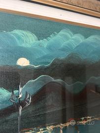 Dipinto che rappresenta Napoli con colori intensi e riflessi sull’acqua, raffigurante barche, montagne e luce lunare. Cornice importante in stile classico, in ottime condizioni con una sovrapposizione di oro, bianco e oro e vetro protettivo.