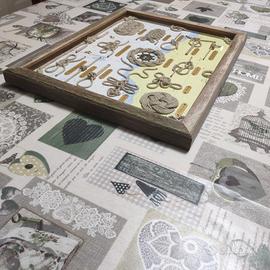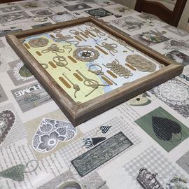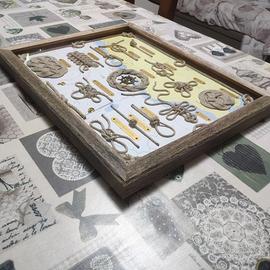 Vendo quadro di nodi composto da quattordici nodi fondamentali ed ornamentali, realizzati in cima di canapa da 3 mm di diametro e posizionati su di uno sfondo costituito da una cartina nautica. I nodi sono stati opportunamente rifiniti, alle loro estremità, con una legatura piana in filo di cotone grigio. Alla base di ciascun nodo è presente una targhetta, costruita in sottile lamina di ottone opportunamente sagomata e fissata mediante chiodini di ottone, che ne identifica la esatta denominazione. La cornice del quadro è stata realizzata in pregiato listello di teak invecchiato, proveniente dal ponte di una barca a vela d'epoca. Completano il quadro due ancorette in ottone lucidato a specchio, poste nella parte superiore del quadro, ed un timone realizzato in ottone brunito, posizionato al centro del paglietto rotondo. Misure 49x38 cm.