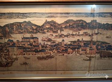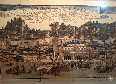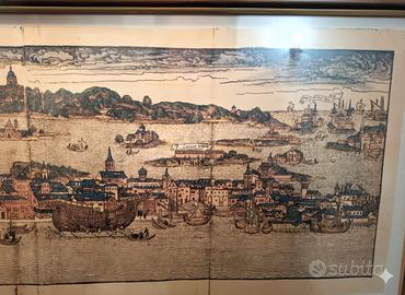 Vendo Quadro di Venezia nel Rinascimento, disegno di Erhard Reuwich. Dimensione Quadro: 112,5x23,5cm. L'immagine mostra la Civitas Veneciarum, una stampa raffigurante una veduta di Venezia. Si tratta di un'incisione a colori basata su un disegno di Erhard Reuwich, originariamente pubblicata nel 1486 nell'opera Peregrinatio in terram sanctam. La stampa si concentra sul fronte meridionale della città, dalla Punta di Sant'Antonio a Santa Marta fino alla Giudecca. Esibisce i principali monumenti di Venezia su uno sfondo che mescola elementi reali e fantastici. L'opera esalta l'identità marittima della città. 250 euro non trattabili, pagabili in contanti con ritiro a mano zona Treviso Selvana. Non spedisco. Autore: Bernhard von Breydenbach, un religioso tedesco. Illustratore: Erhard Reuwich, pittore e incisore che accompagnò l'autore nel viaggio. Anno di pubblicazione: 1486. Luogo: Magonza (Mainz). Tecnica: Xilografia (incisione in legno). Importanza: È uno dei primi libri di viaggio a essere stampato e illustrato, con immagini che rappresentavano fedelmente i luoghi visitati, distinguendosi per il suo realismo. Le incisioni di Reuwich, in particolare le grandi vedute panoramiche come quella di Gerusalemme, sono famose per la loro precisione e dettaglio.