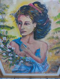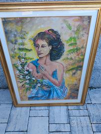 Bellissimo dipinto a mano raffigurante una donna, con cornice in legno. I colori sono vivaci e intensi.