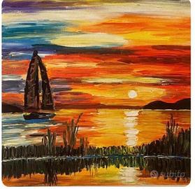 Vendo quadro originale dipinto a mano raffigurante un tramonto sul mare con barca a vela. Colori caldi e molto luminosi, effetto rilassante ed elegante, facile da abbinare a qualsiasi arredamento moderno o classico. ✔ Pezzo unico✔ Pronto da appendere✔ Perfetto per soggiorno, camera, studio o come regalo✔ Ottimo impatto visivo anche da lontano 📐 Dimensioni: 40x40📍 Ritiro a mano preferito – spedizione possibile💬 Rispondo subito ai messaggi 👉 Prezzo conveniente per vendita rapida, no scambi.