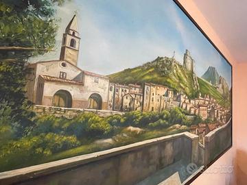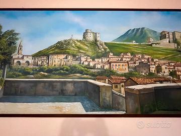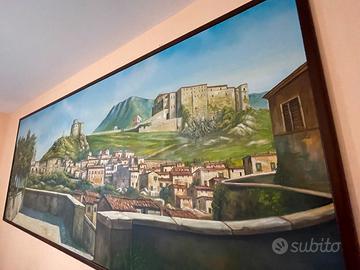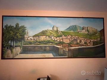 Vendo imponente quadro dipinto a mano raffigurante un borgo italiano (Montesarchio), con vista panoramica sul paese, il castello e il paesaggio collinare.