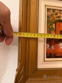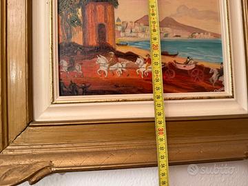Vendo quadro originale dipinto a mano raffigurante paesaggio napoletano con Vesuvio, carrozza e scena d’epoca. Opera realizzata su tavola (cartone telato Maimeri), firmata, con colori caldi e stile classico. 🖼️ Dimensioni: circa 35x40 cm con cornice 🎨 Tecnica: pittura su tavola (olio/acrilico) 🪵 Cornice decorativa inclusa Perfetto come elemento d’arredo in stile classico o vintage.