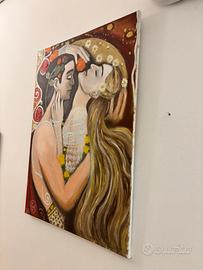 Vendo quadro originale dipinto a mano raffigurante una scena simbolica e romantica di forte impatto visivo. L’opera rappresenta due figure umane avvolte in un abbraccio, circondate da elementi floreali e decorativi che richiamano uno stile elegante e senza tempo. I colori caldi, l’uso dell’oro, dei toni terracotta e delle decorazioni floreali rendono il quadro raffinato, intenso e molto decorativo. Lo stile richiama atmosfere romantiche e artistiche, perfette per valorizzare ambienti ricercati. Dipinto interamente a mano Opera unica, non riproduzione Supporto: tela Stile: figurativo / romantico / decorativo Ideale per salotto, camera da letto, studio, hotel o B&B Il quadro è in ottime condizioni, pronto per essere appeso. --- Dettagli Tipo: quadro dipinto a mano Tecnica pittorica: tradizionale (olio o acrilico) Supporto: tela Cornice: non presente (come da foto) --- Consegna 📍 Ritiro a mano disponibile in zona Oltretorrente 📦 Spedizione possibile con imballaggio accurato (spese a carico dell’acquirente)