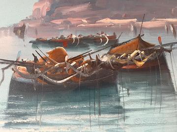 🎨Bellissimo quadro dipinto a mano ad olio, raffigurante un paesaggio marino con barche e costa sullo sfondo. I colori tenui dell'alba e i riflessi sull'acqua creano un'atmosfera