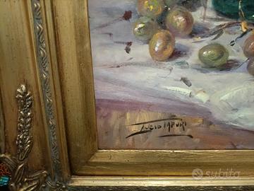 Meraviglioso dipinto ad olio su tavola del grande maestro Lucio Tafuri di cm 30 x 40. L'opera è perfettamente conservata e raffigura una lussureggiante natura morta. Come da foto il dipinto ha una sua cornice ben conservata che però è da considerarsi omaggio insieme all'acquisto del quadro