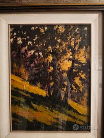 Vendo quadro dipinto a olio anno '78 firmato dall' artista, intitolato "Autunno tra i castani" con cornice in legno chiaro con modanature decorative. Molto bene tenuto. spedizione a carico dell' acquirente.