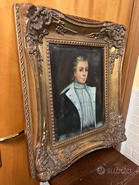 Il dipinto è incorniciato in una cornice elaborata e decorata, che appare essere dorata con dettagli floreali e a volute. Il legno o il materiale della cornice è pesante e d'aspetto antico con delle sbeccatute in alcuni punti ben visibili in foto. La cornice è di tipo elaborato e decorato, in stile che richiama l'epoca Barocca o Rococò. Caratteristiche Principali della cornice.