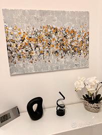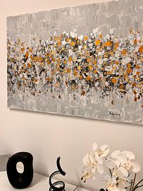 Dipinto astratto materico, realizzato a mano con tecnica mista su tela. L'opera è caratterizzata da una base testurizzata sui toni del grigio e del bianco, su cui si fondono bagliori di foglia oro e tocchi di nero profondo. Il quadro è pronto per essere appeso al muro Dettagli: • Tecnica: Mista su tela (pittura acrilica, foglia oro, stucco) • Dimensioni: 100x70 • Supporto: Tela tesa su telaio in legno • Stile: Astratto, materico • Colori predominanti: Grigio, bianco, oro, nero