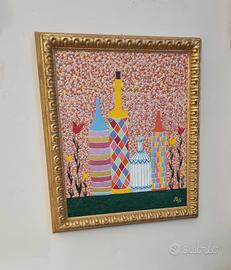 Nicola Masi artista in Firenze propone dipinto Originale (fatto a mano) tecnica mista acrilico su tela di arte contemporanea ,titolo dell opera " LE BOTTIGLIE " con autocertificazione e timbro opera unica originale.Misure interne tela 50×60 misure esterne 61×71con cornice in legno artigianale .MASI ARTE Firenze............................................................,,,,,,,,,,,,,,,,,,,,,,............,,,,,...............,,,