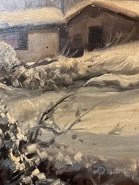 Vendo quadro dipinto a olio su tela, raffigurante paesaggio invernale con alberi e case.