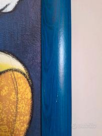 Bellissimo quadro raffigurante Topolino vintage (Mickey Mouse), iconico personaggio Disney. Il disegno ha uno stile classico, con colori vivaci e dettagli curati. Il fondo scuro fa risaltare la figura di Topolino in movimento, allegro e dinamico.