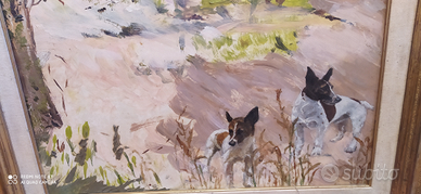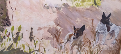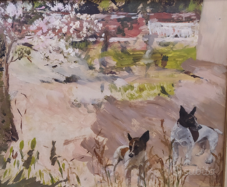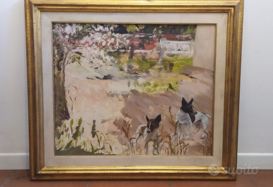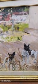 bel grande quadro a olio"due cani Jack Rassel in giardino"
