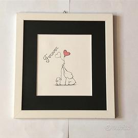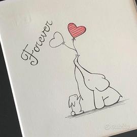 Quadretto con cornice in legno bianco e passepartout nero con disegno di elefantino e coniglietto con palloncini a forma di cuore intrecciati e frase "Forever".