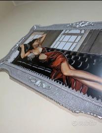 Splendido quadro d’arredamento dallo stile raffinato ideale per chi cerca un elemento di design che unisca eleganza e fascino. Il contrasto tra il rosso dell’abito, il nero del divano e la pregiata cornice argentata lavorata con decori barocchi in rilievo, rende l’oggetto un punto focale perfetto per una camera da letto o un salotto ricercato. Disponibile sul mio profilo anche quadro coordinato con soggetto differente (Scarface).