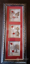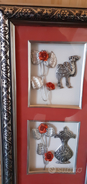 Splendido quadro stile arabo con cornice argentata intarsiata in legno e tre finestre con rose rosse e figure in metallo di pregevole fattura (cammello, anfora e albero). Cm 42x17. Rivestito sul retro con gancio per appenderlo a parete.