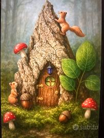 Tela 3D quadro, con alcuni pezzi presi in natura e altri comprati. Raffigura un mondo fatato, una porticina nascosta sotto un tronco, immerso in un bosco fantasy. Con scoiattoli, funghi. La lanterna si illumina al buio.