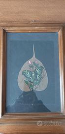Delicato quadro dipinto a mano su una foglia secca, raffigurante una farfalla con fiori.