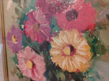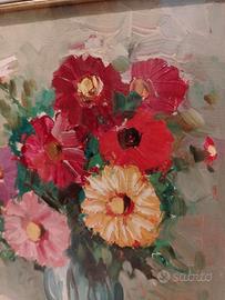 Bellissimo dipinto raffigurante un vaso di fiori variopinti. I colori sono vivaci e ben applicati sulla tela.