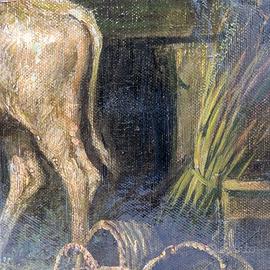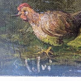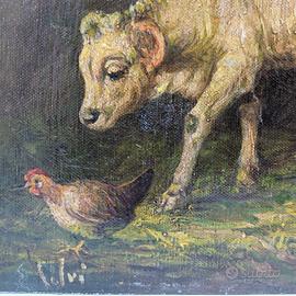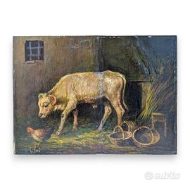 Il quadro raffigura un vitello e una gallina in una stalla con cesti di vimini, fascine e dettagli veristi.