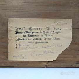 Al verso è presente un cartiglio con timbro del Prof. Cesare Bellini, perito Tribunale Milano, membro Collegio Periti d'Arte della Lombardia. Sul cartiglio il prof. Bellini ha scritto a penna: "19/10/48 Dipinto di Ercole Calvi 1889 Perizia 127/10 Cesare Bellini".