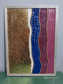 Quadro lavorato e dipinto a mano, la parte dorata è stata realizzata con foglia d'oro il restante con gesso acrilico.