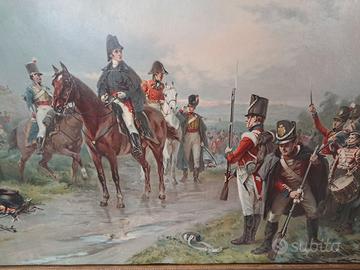 Bellissima e antica Oleografia con cornice in legno misure 93x67x4p (compresa cornice) raffigurante esercito Napoleonico nella Battaglia di Waterloo. Consegna a mano su Foggia. NO PERDITEMPO. Volendo possibilità di restauro cornice con costo a parte.