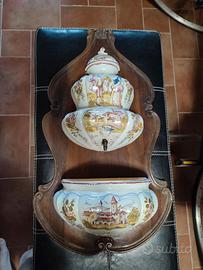Cerchi un pezzo d’arredo che unisca arte, storia e funzionalità? Questa fontana da parete in ceramica dipinta a mano è un autentico gioiello vintage, composto da tre elementi montati su una tavola in legno intagliato. Ogni contenitore raffigura scene rurali europee con paesaggi, edifici e figure umane, in uno stile che richiama la tradizione ceramica italiana.