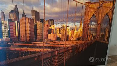 Questo spettacolare quadro fotografico ritrae il ponte di Brooklyn con lo skyline di Manhattan illuminato dalla calda luce del tramonto. L’immagine ad alta definizione è montata su un elegante telaio con cornice in alluminio color argento, ideale per ambienti moderni e raffinati.