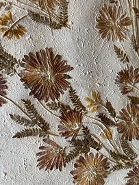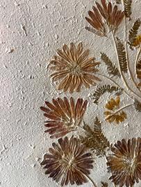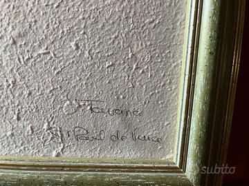 Il quadro mi è stato regalato da un'amica. So che lei lo ha acquistato in una galleria ma non saprei dare informazioni specifiche perché non ho più modo di chiedere a quell'amica. La parte del retro della cornice c'è la carta un pò rotta. Il quadro è in ottime condizioni e anche la cornice. La cornice è stata fatta su misura ed è molto fine sui toni del verde, stile classico. I fiori sono pressati su una carta riciclata fatta a mano. Firmato Tavaria St Paul de Vance 76,5x94,8 di altezza (in centimetri)