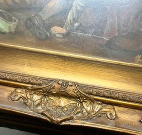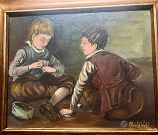 Dipinto raffigurante due bambini intenti a giocare a carte. - Cornice in legno intagliato. - Tela dipinta a mano.
