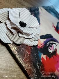 tela creativa in carta di riso lavorata con paste materiche dipinte a mano, colori per vetro, dettagli in oro fuso e dettagli artigianali