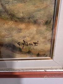 In vendita dipinto originale ad olio su cartone raffigurante un paesaggio rurale toscano con casolare, campi coltivati e balle di fieno, firmato Giancarlo Fioretti in basso a destra.