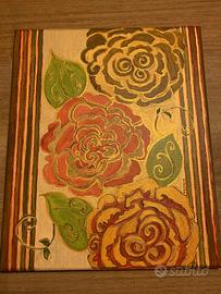 Splendido dipinto a mano su tela caratterizzato da uno stile vibrante e materico. Le tre rose stilizzate in tonalità ocra, corallo e bronzo sono arricchite da dettagli dorati in rilievo che riflettono la luce, donando profondità all'opera. I bordi decorati a righe conferiscono un tocco moderno e originale, perfetto per chi cerca un pezzo unico per dare carattere a una zona living o a una camera da letto boho-chic.