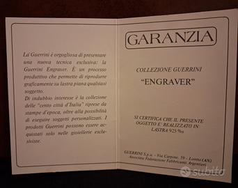 Vendo quadro originale Guerrini S.p.A., collezione ENGRAVER, realizzato su lastra in argento 925‰. 📐 Misure: • Quadro con cornice: 44,5 × 38,5 cm • Lastra in argento: 24 × 19 cm 🆕 Condizioni: Oggetto NUOVO, mai esposto, sempre conservato in scatola. 📦 Completo di tutto: ✔ scatola originale ✔ sacchetto Guerrini ✔ certificato di garanzia originale ✔ cornice in legno con profilo dorato ✔ attacco posteriore integro Elegante quadro decorativo, ideale per collezionisti, regalo di pregio o arredamento classico. Collezione fuori produzione. Prezzo di listino originale in gioielleria superiore ai 500 €. 📍 Possibile ritiro a mano a Genova o spedizione accurata. NUOVO!