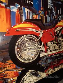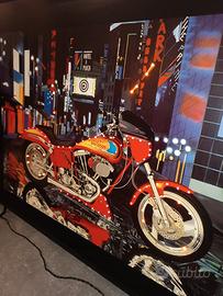 Un pezzo unico per gli amanti delle moto e dello stile metropolitano! Quadro raffigurante una Harley Davidson su sfondo urbano notturno, arricchito con luci LED colorate integrate che donano un effetto tridimensionale e dinamico.